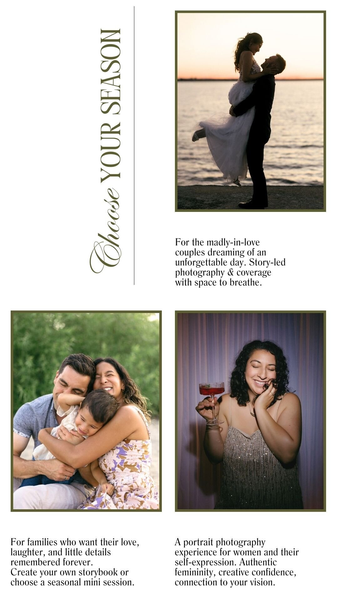 My approach is relaxed and genuine so you feel comfortable while I capture what matters most: the joy of a wedding day, the laughter of a family, or the quiet power of a portrait. I’m a photographer who loves people, their stories, light, and the tiny details that make life feel big. I document life honestly and beautifully, full of emotion, and turn your moments into something artful, personal, and entirely yours.